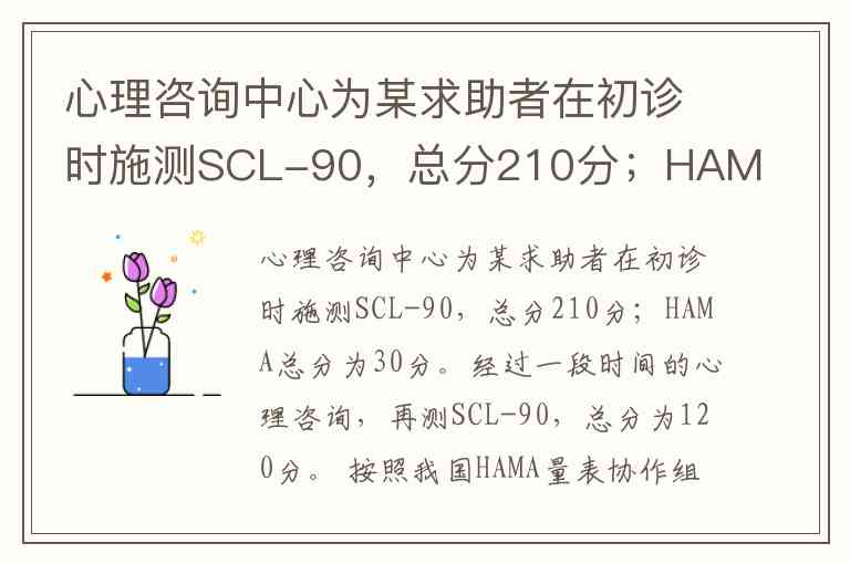 值得注意的是,不同文献对HAMA分数区间的细分略有差异。例如部分资料将21-28分定义为“明显焦虑”,而30分已显著超出这一范围,进入最高等级的严重焦虑区间。这一结果与SCL-90总分从210分降至120分的变化趋势形成对比,可能反映该求助者在焦虑情绪与其他心理症状改善速度上的差异。临床评估时需结合访谈观察与症状持续时间,避免单纯依赖量表分数下结论。
