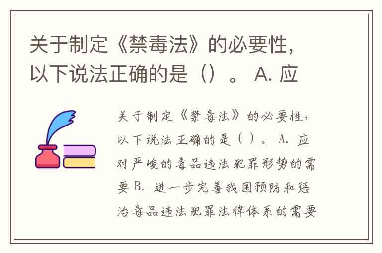 关于制定《禁毒法》的必要性,以下说法正确的是()。 A. 应对严峻的毒品违法犯罪形势的需要 B. 进一步完善我国预防和惩治毒品违法犯罪法律体系的需要 C. 履行国际禁毒公约的需要 D. 以上都是