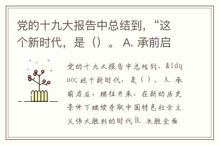 党的十九大报告中总结到,“这个新时代,是()。 A. 承前启后、继往开来、在新的历史条件下继续夺取中国特色社会主义伟大胜利的时代 B. 决胜全面建成小康社会、进而全面建设社会主义现代化强国的时代 C. 全国各族人民团结奋斗、不断创造美好生活、逐步实现全体人民共同富裕的时代 D. 全体中华儿女戮力同心、奋力实现中华民族伟大复兴中国梦的时代 E. 我国日益走近世界舞台中央、不断为人类作出更大贡献的时代