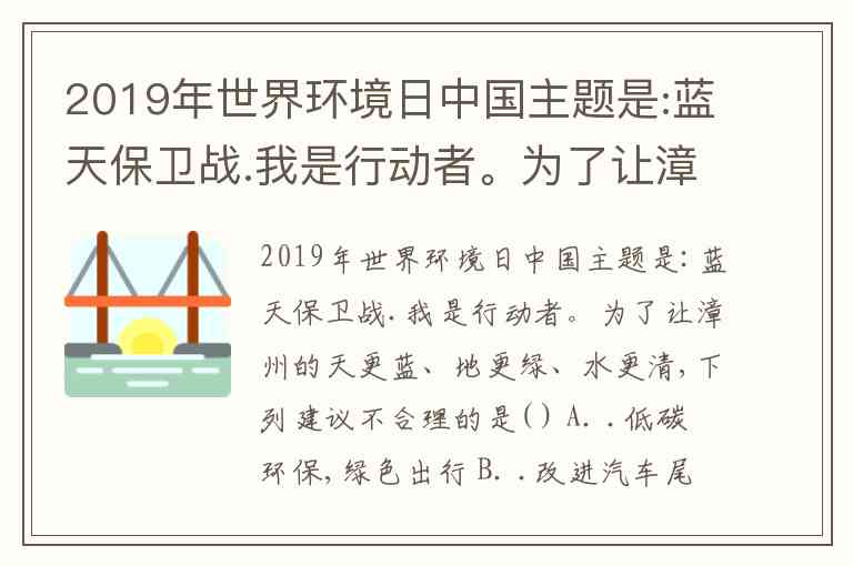 2019年世界环境日中国主题是:蓝天保卫战.我是行动者。为了让漳州的天更蓝、地更绿、水更清,下列建议不合理的是( ) A. .低碳环保,绿色出行 B. .改进汽车尾气的净化技术 C. •建筑工地安装降尘装置 D. .禁止使用农药和化肥,保护水体