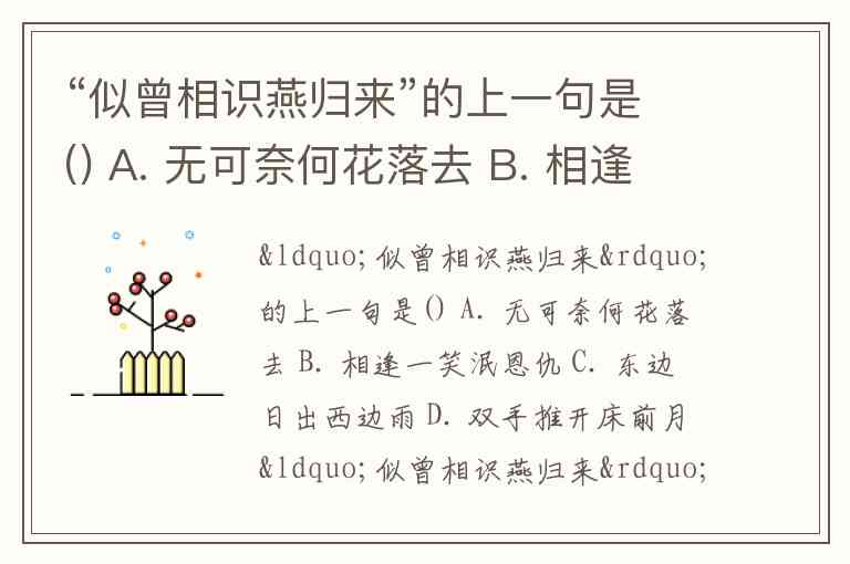 “似曾相识燕归来”的上一句是() A. 无可奈何花落去 B. 相逢一笑泯恩仇 C. 东边日出西边雨 D. 双手推开床前月