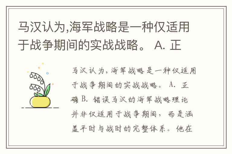 马汉认为,海军战略是一种仅适用于战争期间的实战战略。 A. 正确 B. 错误