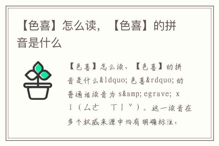 “色喜”的普通话读音为 sè xǐ(ㄙㄜˋ ㄒㄧˇ)。这一读音在多个权威来源中均有明确标注,其中“色”读去声(sì),“喜”读阳平(xǐ),两个字均为独立音节,需清晰分开发音。