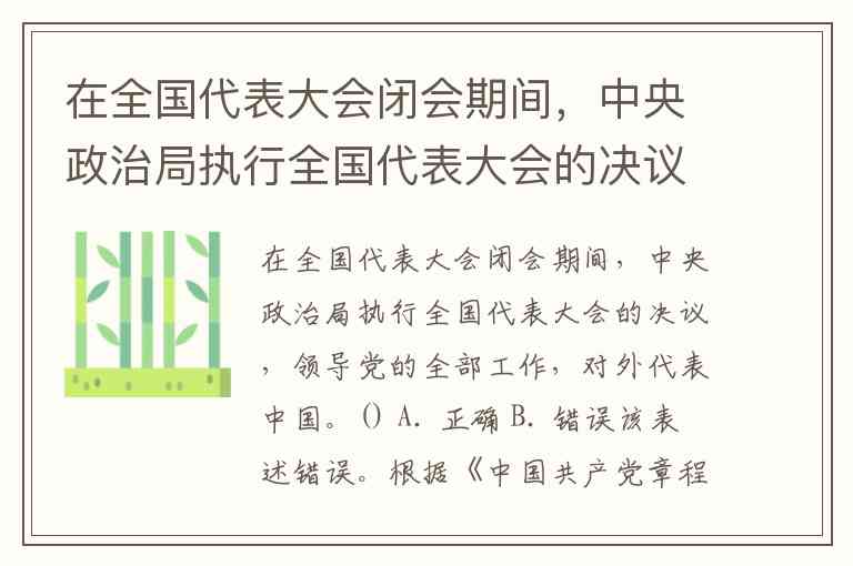 在全国代表大会闭会期间,中央政治局执行全国代表大会的决议,领导党的全部工作,对外代表中国。() A. 正确 B. 错误
