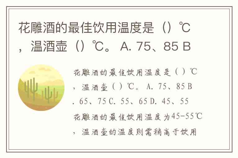 花雕酒的最佳饮用温度是()℃,温酒壶()℃。 A. 75、85 B. 65、75 C. 55、65 D. 45、55