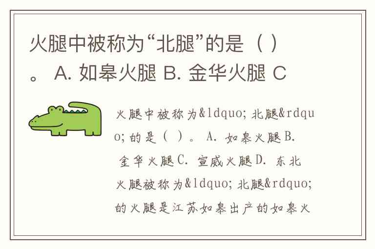 火腿中被称为“北腿”的是( )。 A. 如皋火腿 B. 金华火腿 C. 宣威火腿 D. 东北火腿