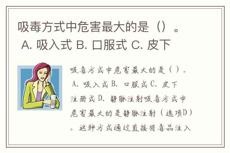 吸毒方式中危害最大的是()。 A. 吸入式 B. 口服式 C. 皮下注册式 D. 静脉注射