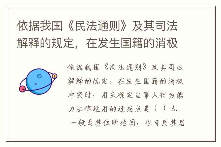 依据我国《民法通则》及其司法解释的规定,在发生国籍的消极冲突时,用来确定当事人行为能力法律适用的连接点是( ) A. 一般是其住所地国,也可用其居住地国 B. 一般是其居住地国,如未定居,则用其住所地国 C. 最后拥有的国籍 D. 住所