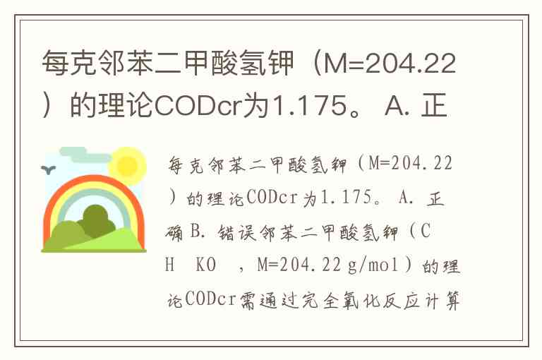 每克邻苯二甲酸氢钾(M=204.22)的理论CODcr为1.175。 A. 正确 B. 错误