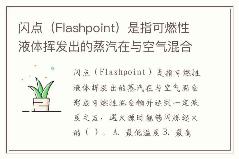 闪点(Flashpoint)是指可燃性液体挥发出的蒸汽在与空气混合形成可燃性混合物并达到一定浓度之后,遇火源时能够闪烁起火的( )。 A. 最低温度 B. 最高温度 C. 最大粘度 D. 最小粘度