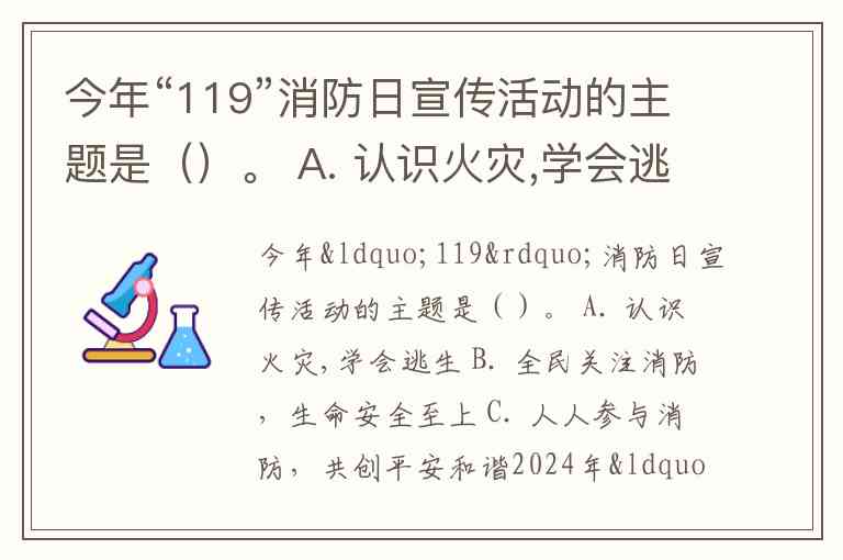 今年“119”消防日宣传活动的主题是()。 A. 认识火灾,学会逃生 B. 全民关注消防,生命安全至上 C. 人人参与消防,共创平安和谐