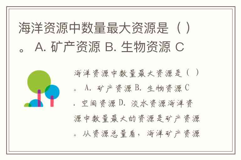 海洋资源中数量最大资源是( )。 A. 矿产资源 B. 生物资源 C. 空间资源 D. 淡水资源