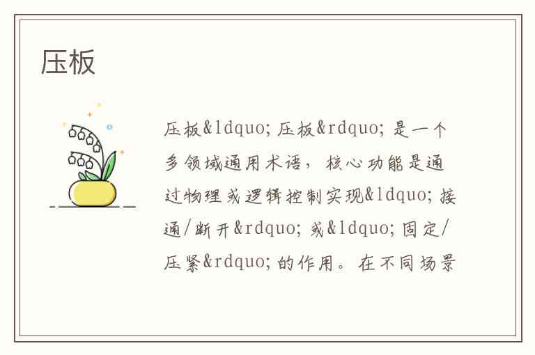 “压板”是一个多领域通用术语,核心功能是通过物理或逻辑控制实现“接通/断开”或“固定/压紧”的作用。在不同场景下,其形态和用途差异显著,最常见于电力系统、工业制造和建筑装饰三大领域。