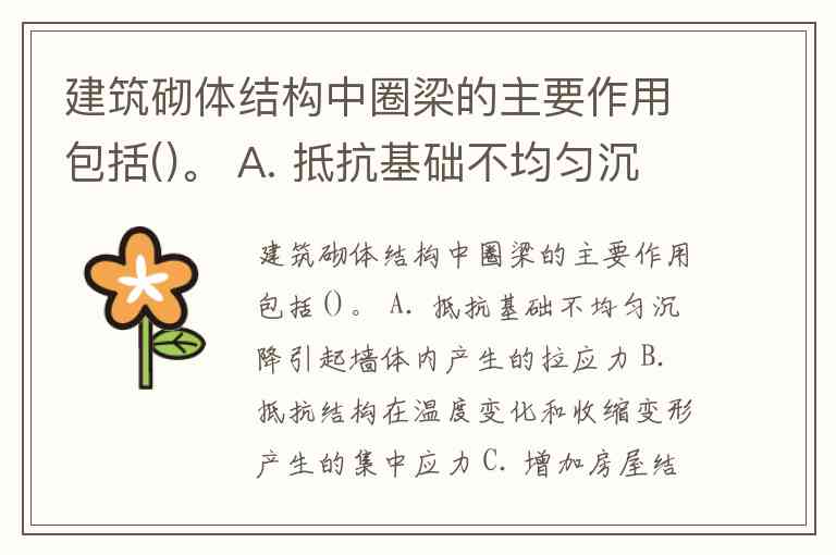 选项E“传递上部载荷”并非圈梁的主要功能。虽然部分文献提及圈梁可“分担荷载”,但其核心作用是构造加强而非受力承重,载荷传递主要由承重墙和基础承担。