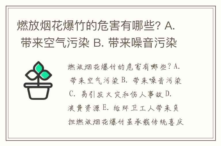燃放烟花爆竹的危害有哪些? A. 带来空气污染 B. 带来噪音污染 C. 易引发火灾和伤人事故 D. 浪费资源 E. 给环卫工人带来负担