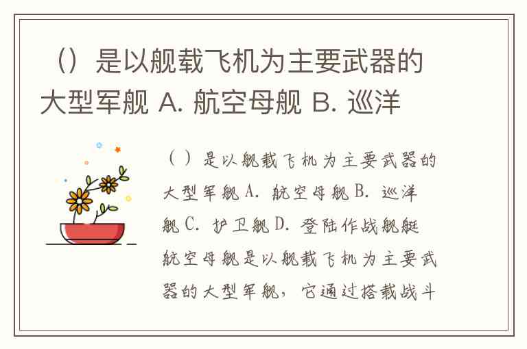 ()是以舰载飞机为主要武器的大型军舰 A. 航空母舰 B. 巡洋舰 C. 护卫舰 D. 登陆作战舰艇