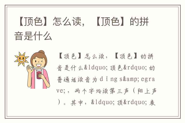 “顶色”的普通话读音为 dǐng sè,两个字均读第三声(阳上声)。其中,“顶”表示最高处或最上部,“色”指颜色,组合起来通常指物体最上方呈现的颜色,或在某些特定领域(如印刷、纺织)中表示最表层的颜色效果。在实际口语中,当两个第三声字连读时,前一个字会变调为第二声(阳平),因此实际发音更接近 dǐng (变调为díng) sè,但标准拼音标注仍为 dǐng sè。