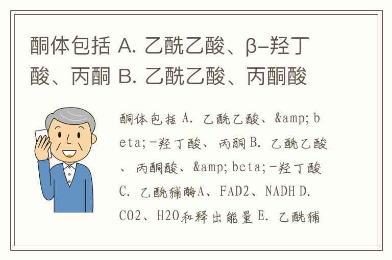 酮体包括 A. 乙酰乙酸、β-羟丁酸、丙酮 B. 乙酰乙酸、丙酮酸、β-羟丁酸 C. 乙酰辅酶A、FAD2、NADH D. CO2、H2O和释出能量 E. 乙酰辅酶A、NADPH、CO2