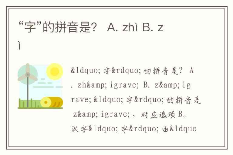 汉字“字”由“宀”(表示房屋)和“子”(表示孩子)组成,本义为生育、养育,后引申为文字符号。其普通话读音为去声(第四声),发音时声调从高到低,与选项 B 的 zì 完全匹配。选项 A 的“zhì”对应的常见汉字为“治”“智”“志”等,与“字”的读音不符。