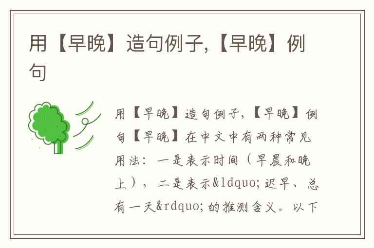 【早晚】在中文中有两种常见用法:一是表示时间(早晨和晚上),二是表示“迟早、总有一天”的推测含义。以下是不同语境的造句示例: