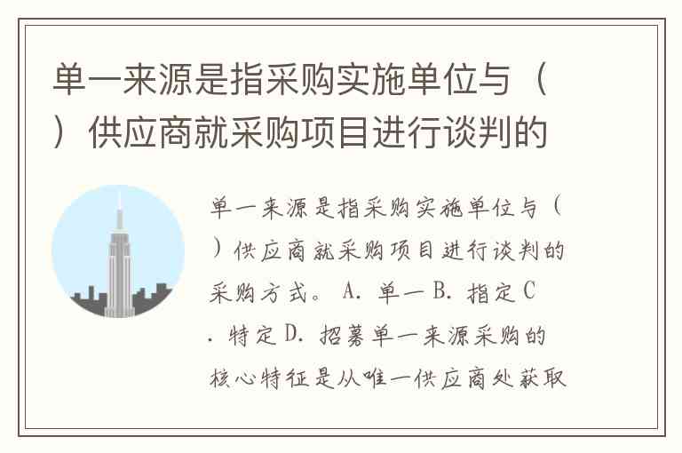 单一来源是指采购实施单位与()供应商就采购项目进行谈判的采购方式。 A. 单一 B. 指定 C. 特定 D. 招募