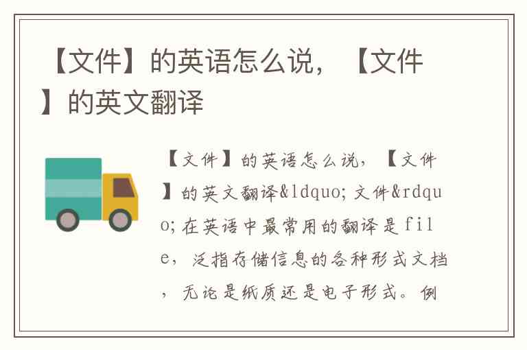 “文件”在英语中最常用的翻译是 file,泛指存储信息的各种形式文档,无论是纸质还是电子形式。例如:“Please save the file on your desktop”(请把文件保存在桌面上)。