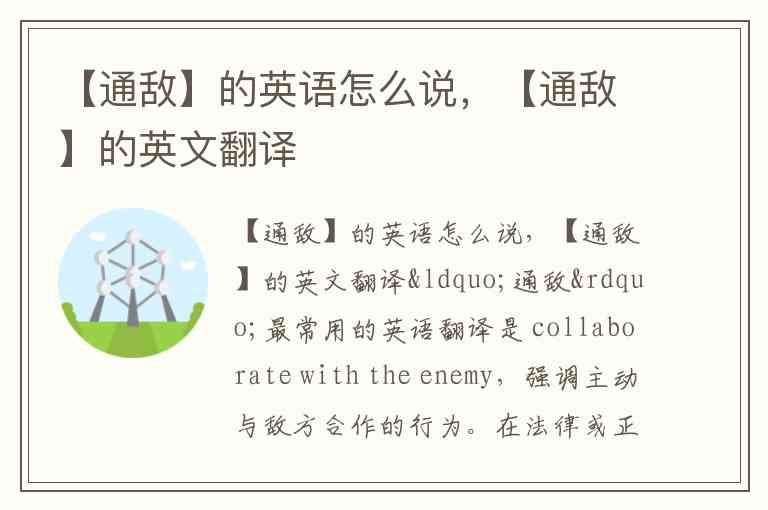“通敌”最常用的英语翻译是 collaborate with the enemy,强调主动与敌方合作的行为。在法律或正式语境中,也可用 treason(叛国罪)或 aiding the enemy(资助敌人),但这些表述更侧重行为性质和后果。