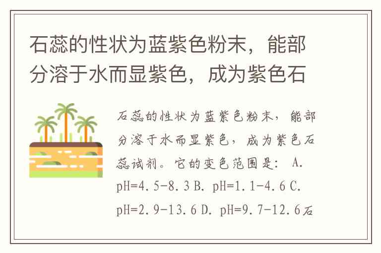 石蕊的性状为蓝紫色粉末,能部分溶于水而显紫色,成为紫色石蕊试剂。它的变色范围是: A. pH=4.5-8.3 B. pH=1.1-4.6 C. pH=2.9-13.6 D. pH=9.7-12.6