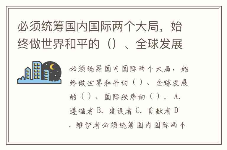 必须统筹国内国际两个大局,始终做世界和平的()、全球发展的()、国际秩序的()。 A. 遵循者 B. 建设者 C. 贡献者 D. 维护者