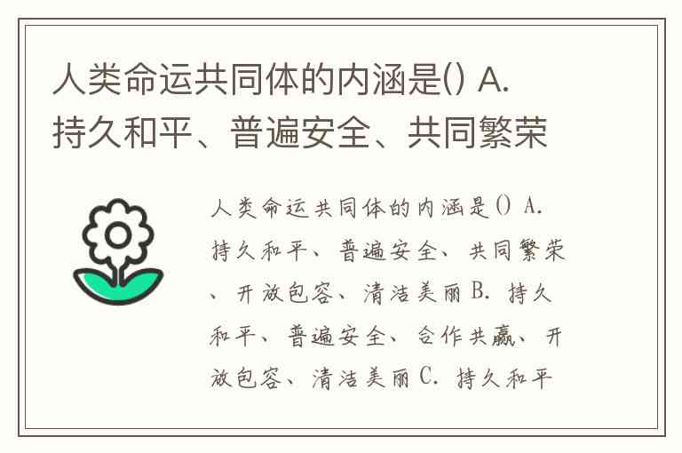 人类命运共同体的内涵是() A. 持久和平、普遍安全、共同繁荣、开放包容、清洁美丽 B. 持久和平、普遍安全、合作共赢、开放包容、清洁美丽 C. 持久和平、共同安全、普遍繁荣、开放包容、清洁美丽 D. 持久和平、普遍安全、共同繁荣、交流互鉴、清洁美丽