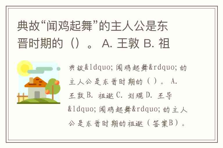 典故“闻鸡起舞”的主人公是东晋时期的()。 A. 王敦 B. 祖逖 C. 刘琨 D. 王导