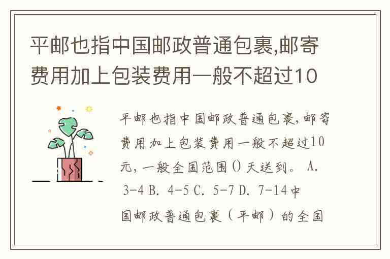 平邮也指中国邮政普通包裹,邮寄费用加上包装费用一般不超过10元,一般全国范围()天送到。 A. 3-4 B. 4-5 C. 5-7 D. 7-14