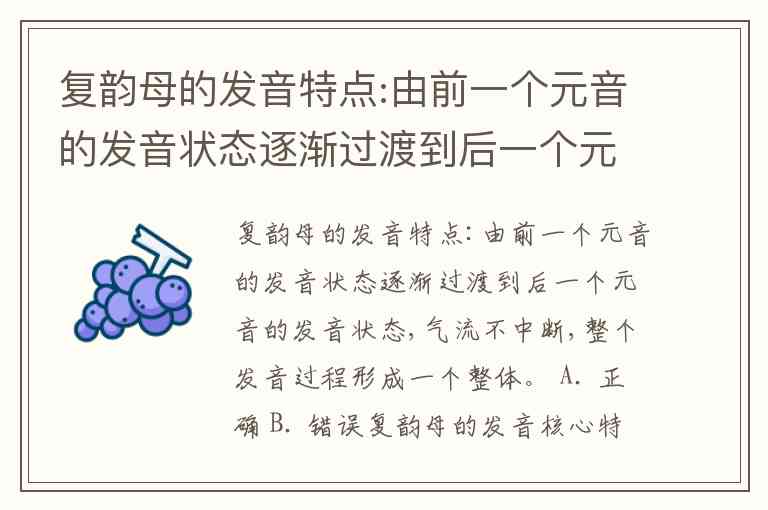 复韵母的发音特点:由前一个元音的发音状态逐渐过渡到后一个元音的发音状态,气流不中断,整个发音过程形成一个整体。 A. 正确 B. 错误