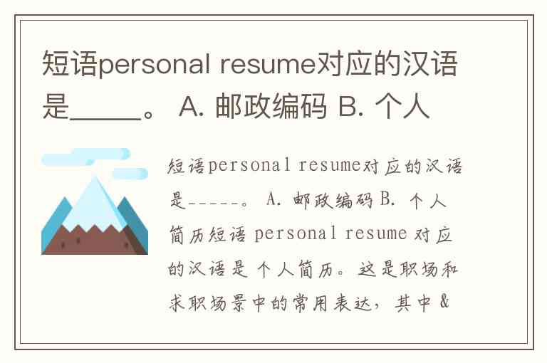 短语personal resume对应的汉语是_____。 A. 邮政编码 B. 个人简历