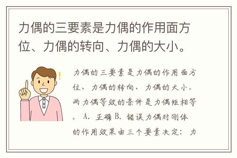 力偶对刚体的作用效果由三个要素决定:力偶矩的大小(力与力偶臂的乘积)、力偶的转向(顺时针或逆时针)和力偶的作用面方位(力偶所在平面的空间位置)。这三个要素共同描述了力偶的全部特征。