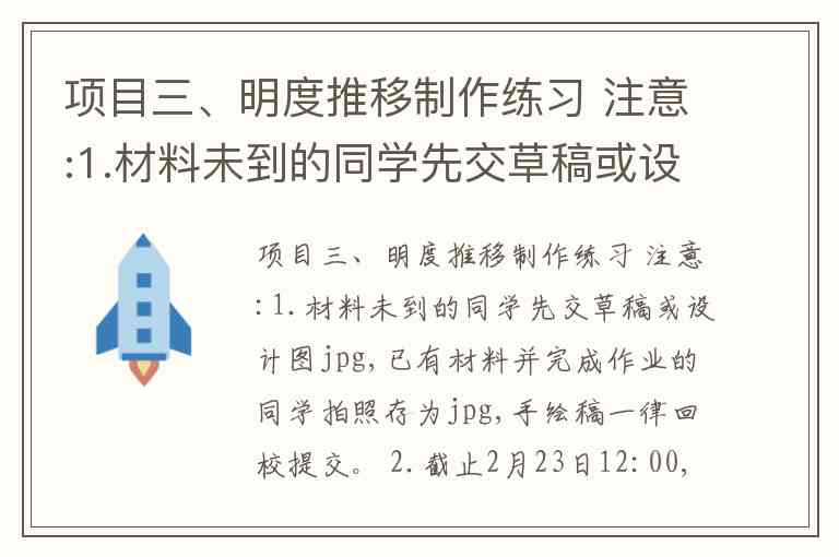 项目三、明度推移制作练习 注意:1.材料未到的同学先交草稿或设计图jpg,已有材料并完成作业的同学拍照存为jpg,手绘稿一律回校提交。 2.截止2月23日12:00,超时将导致作业分数为零。 【作业要求】 使用一种颜色进行明度推移。在相应的图形上表现明度渐变的视觉效果。明度推移限定在1个色相,超过9层色阶。 【作业数量】 1张。作业纸张的大小为A4。图形在12×12 cm大小范围内。 【步骤提示】 先设计好适合推移的图形,再将明度推移用色全部调制完毕。然后将调制好的色彩按照图形上色,形成明度渐变的效果。 【作业提示】 注意图形的整体感。在上色时要力求色彩均匀、等色阶的渐变清楚。能够表现出一定的层次、空间感将更好。 (以上图片仅供参考)