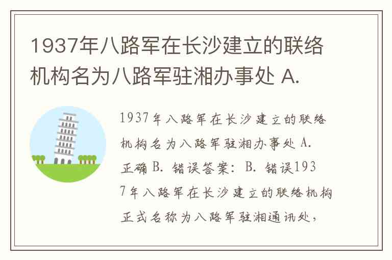 1937年八路军在长沙建立的联络机构名为八路军驻湘办事处 A. 正确 B. 错误