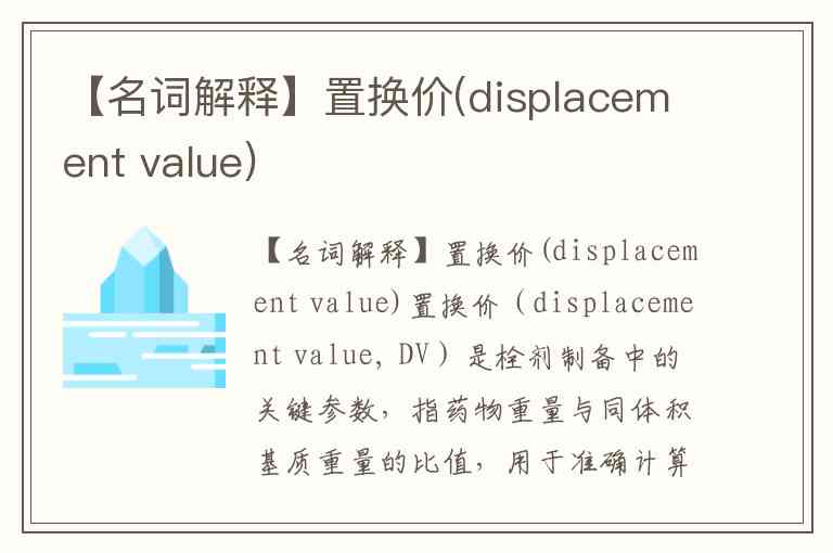置换价(displacement value, DV)是栓剂制备中的关键参数,指药物重量与同体积基质重量的比值,用于准确计算含药栓剂所需基质用量。这一概念最早基于可可豆脂基质提出,但现代制剂中基质种类已扩展至半合成脂肪酸酯、聚乙二醇等,因此实际应用中常需测定“相对置换价”。