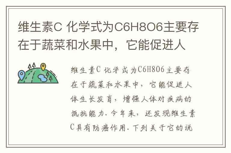 维生素C 化学式为C6H8O6主要存在于蔬菜和水果中,它能促进人体生长发育,增强人体对疾病的抵抗能力.今年来,还发现维生素C具有防癌作用.下列关于它的说法不正确的是__ A. 维生素C中含有6个碳原子、8个氢原子和6个氧原子 B. 青少年应多吃水果蔬菜,切忌偏食 C. 维生素C由碳、氢、氧三种元素组成 D. ______ .
