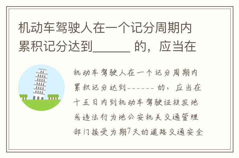 机动车驾驶人在一个记分周期内累积记分达到______ 的,应当在十五日内到机动车驾驶证核发地或违法行为地公安机关交通管理部门接受为期7天的道路交通安全法律、法规和相关知识的教育。 A. 3分 B. 6分 C. 9分 D. 12分