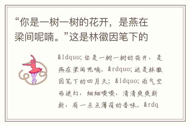 "一切景语皆为情语",名家对四月天的描写本质是内心世界的投射。林徽因以花开、燕呢喃构建明媚意象,暗含对生命的赞美与爱悦;余光中聚焦雨气的迷幻与薄荷香,渗透着细腻的感官体验与抒情个性。阅读这些文字时,读者实则在与作家的情感记忆、审美偏好对话,正如刘湛秋在《雨的四季》中通过雨的形态变化,展现从欣然期待到沉静反思的生命体验。这种精神共鸣印证了①的合理性。