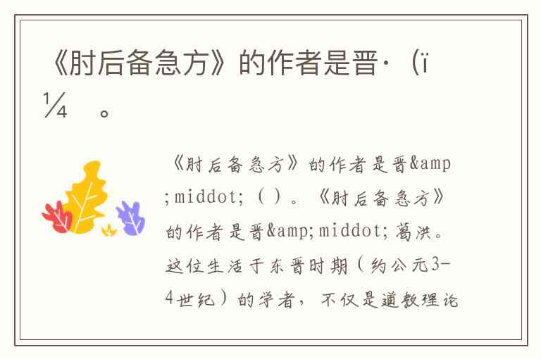 《肘后备急方》的作者是晋·葛洪。这位生活于东晋时期(约公元3-4世纪)的学者,不仅是道教理论家和炼丹家,更是推动中医急救医学发展的关键人物。他将自己100卷的医学巨著《玉函方》精简提炼,汇编成这部仅8卷73篇的实用手册,原名《肘后救卒方》,后经梁代陶弘景增补、金代杨用道附方,最终形成现存的《肘后备急方》版本。