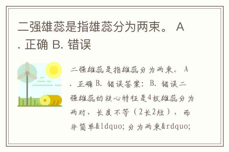 题目混淆了“数量分组”与“长度差异”的本质区别。若仅表述为“分为两束”,可能涵盖如雄蕊数量为2+2但长度一致的情况,这与二强雄蕊的科学定义不符。需特别注意,其术语源于希腊语“di-”(二)和“dynamis”(能力),强调的是功能分化而非单纯的物理分组。