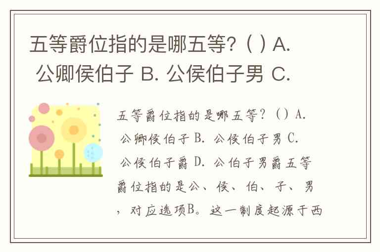 五等爵位指的是哪五等?( ) A. 公卿侯伯子 B. 公侯伯子男 C. 公侯伯子爵 D. 公伯子男爵
