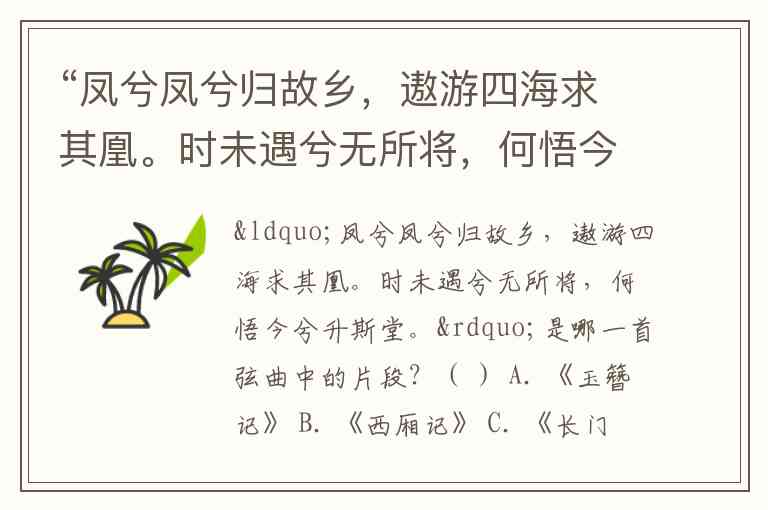 “凤兮凤兮归故乡,遨游四海求其凰。时未遇兮无所将,何悟今兮升斯堂。”是哪一首弦曲中的片段?( ) A. 《玉簪记》 B. 《西厢记》 C. 《长门赋》 D. 《凤求凰》