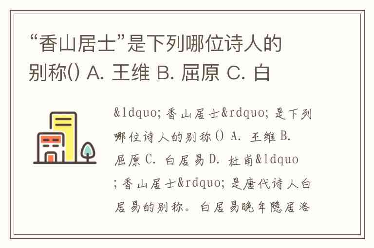 “香山居士”是唐代诗人白居易的别称。白居易晚年隐居洛阳香山,自号“香山居士”,这一雅号与其晚年生活和创作风格密切相关。
