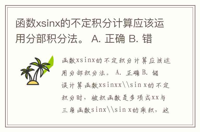 函数xsinx的不定积分计算应该运用分部积分法。 A. 正确 B. 错误