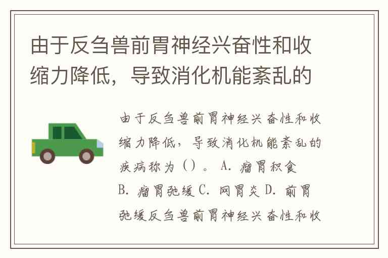 由于反刍兽前胃神经兴奋性和收缩力降低,导致消化机能紊乱的疾病称为 ( ) 。 A. 瘤胃积食 B. 瘤胃弛缓 C. 网胃炎 D. 前胃弛缓