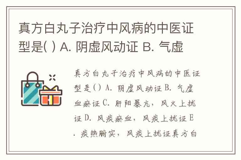 真方白丸子治疗中风病的中医证型是( ) A. 阴虚风动证 B. 气虚血瘀证 C. 肝阳暴亢,风火上扰证 D. 风痰瘀血,风痰上扰证 E. 痰热腑实,风痰上扰证