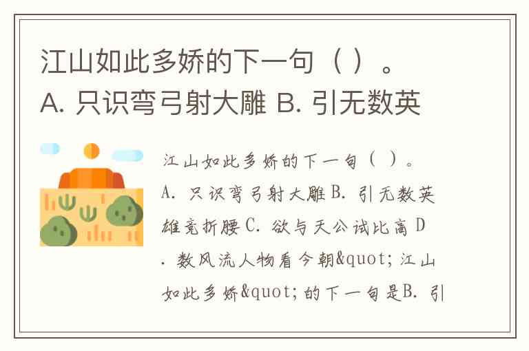 江山如此多娇的下一句( )。 A. 只识弯弓射大雕 B. 引无数英雄竞折腰 C. 欲与天公试比高 D. 数风流人物看今朝